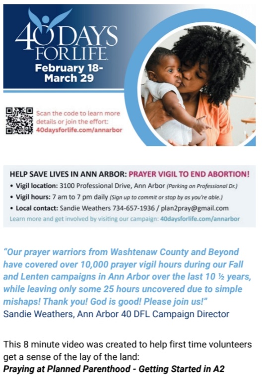 Additionally, you’re invited to join other Christians for 40 Days for Life 365—a year-round campaign of prayer, fasting and peaceful vigil to end abortion in our local community. Please consider joining us once a month, bi-weekly or even weekly, if possible. The 40 Days for Life 365 prayer vigil will take place at the same location Monday through Friday from 8 am until 2 pm with extended hours until 4 pm on Thursdays.. For more information on 40 Days for Life 365 please contact the Campaign Director Sandie Weathers at 734-657-1936 or plan2pray@gmail.com. Please visit 40daysforlife.com/AnnArbor to make your appointment with God, in one hour increments.