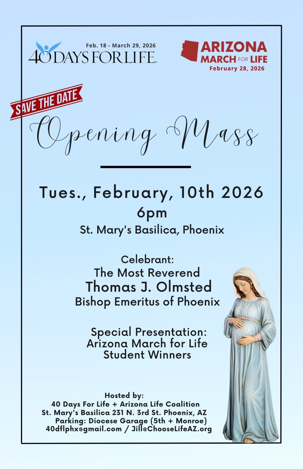 There will be a Catholic Opening Mass to kick off the opening of 40 Days for Life Spring Campaign. Celebrant: Thomas J. Olmsted, Bishop Emeritus of Phoenix. Special Presentation: Arizona March for Life Student Winners. There is a shareable flyer in the resources section.