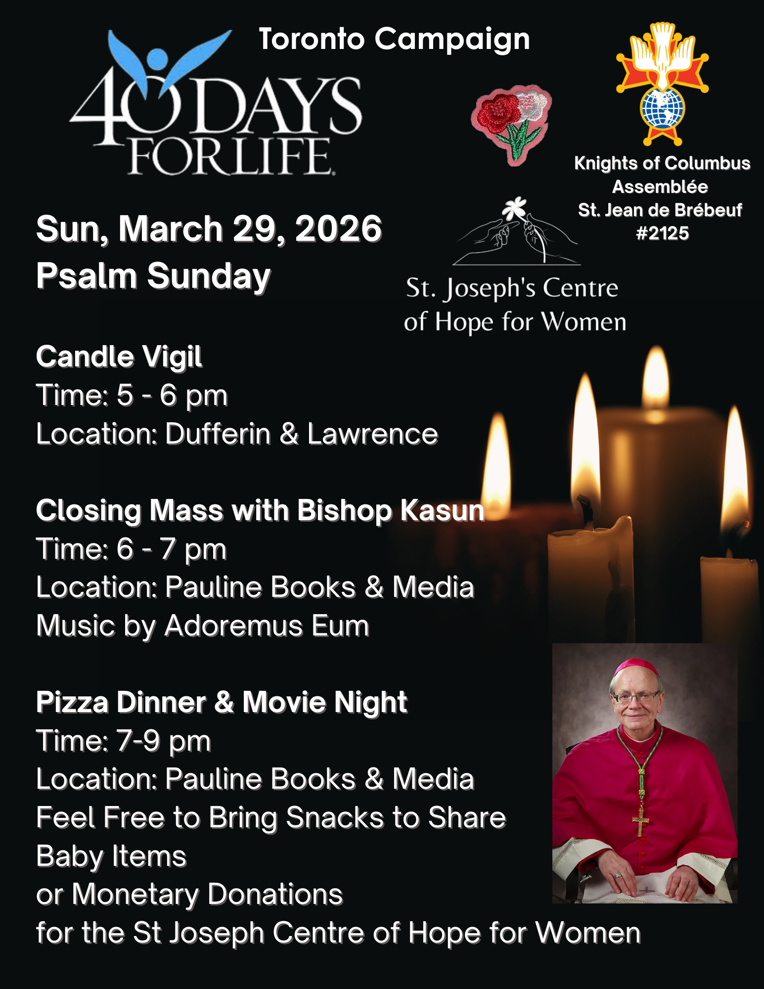 For 40 consecutive days from 7am to 7pm, we will pray for an end to abortion at Lawrence and Dufferin, bearing a peaceful public witness for the sanctity of life.
