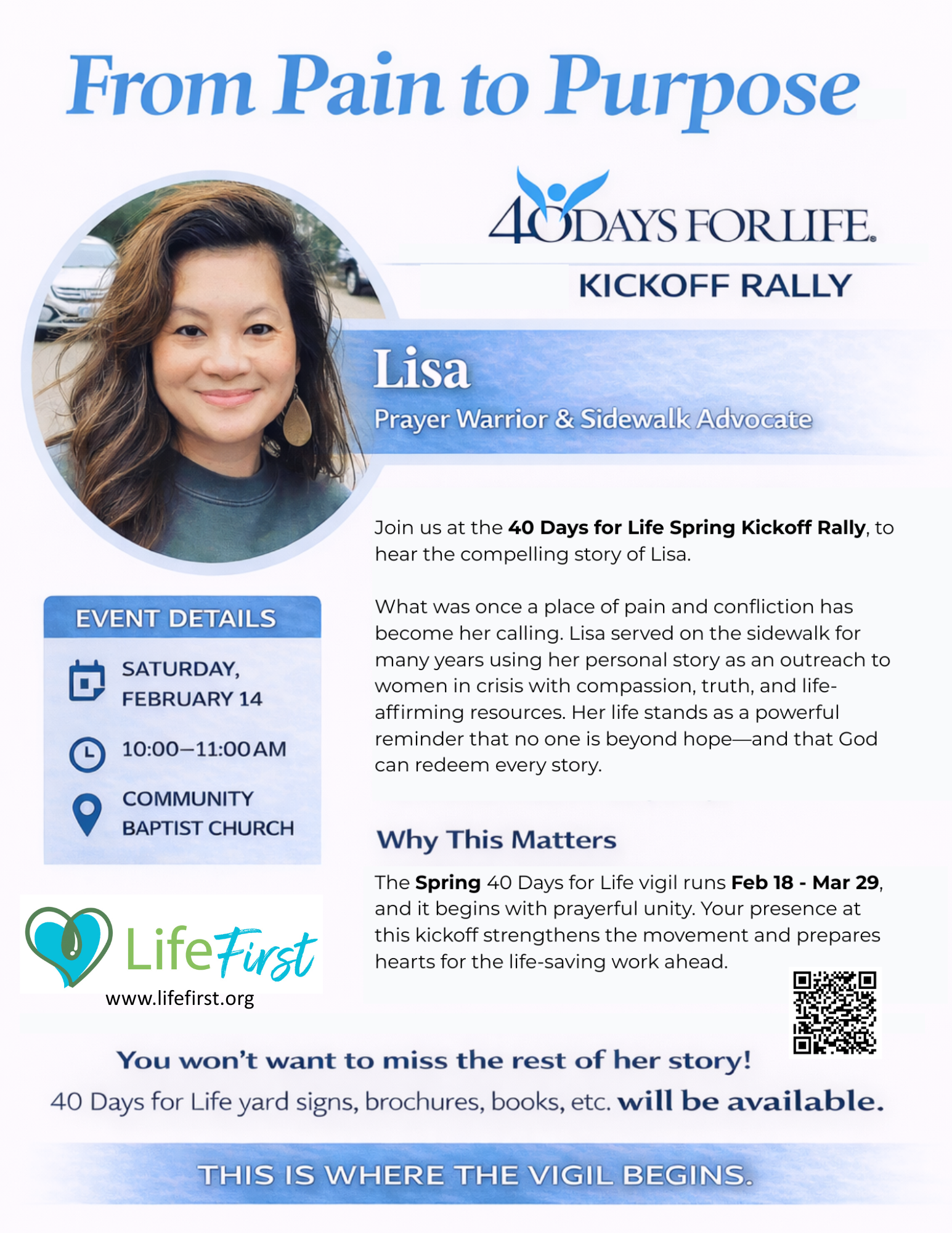 Join us at the 40 Days for Life Spring Kickoff Rally, to hear the compelling story of Lisa.